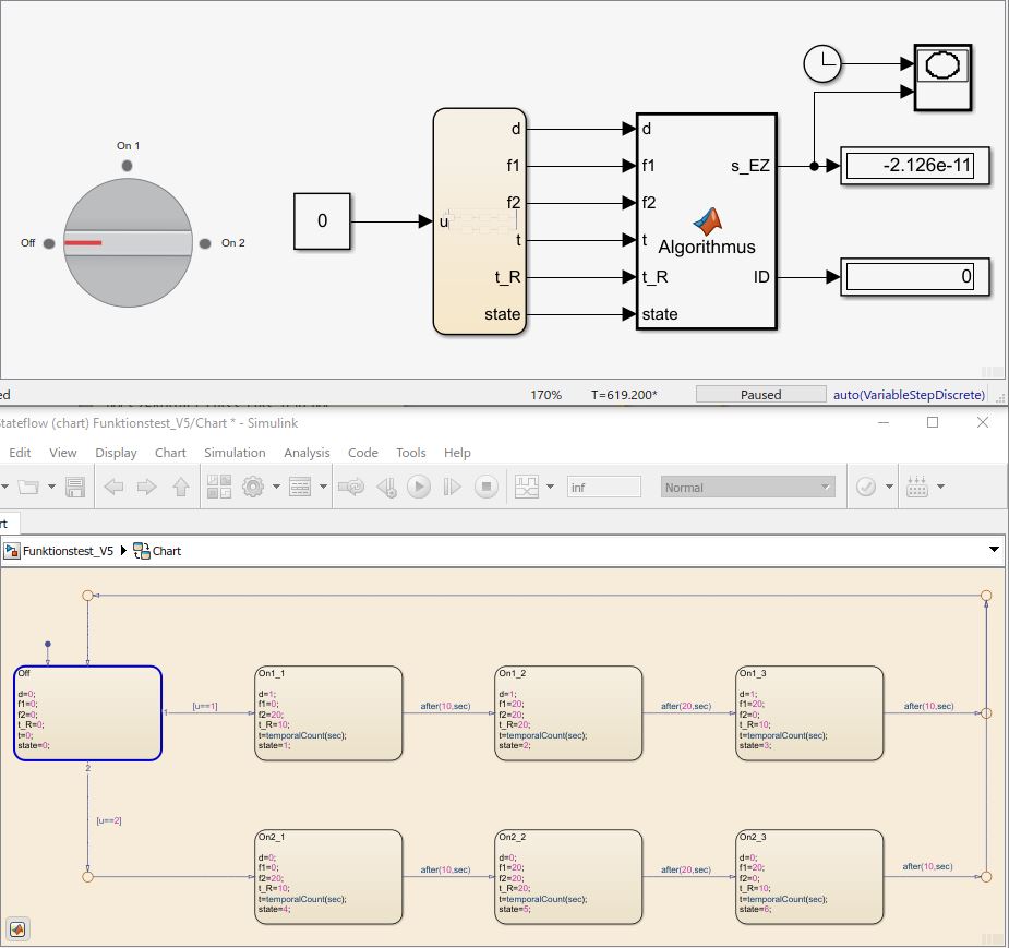 Hinter dem Stateflow Chart ist ein MATLAB Function Block nachgeschaltet. Der wertet die Output-Größen von Stateflow als eigene Input-Größen.