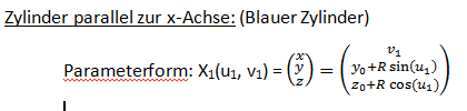 Die Darstellung der Zylinder erfolgt in Parameterdarstellung (bereits berechnet, siehe Bild "Blauer Zylinder" und Bild "Roter Zylinder")