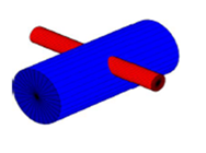 Der blaue Zylinder hat den Radius "R", der rote Zylinder den Radius "r". Die Achse des blauen Zylinders liegt auf der x-Achse, die des roten Zylinders auf der z-Achse.