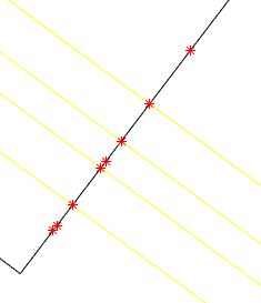 ich gehe davon aus, dass du die Schnittpunkte zwischen den gelben Linien und der schwarzen Linie haben möchtest. Das ist ja erst mal eine einfache Geometrieaufgabe. Vermutlich sind die roten Sterne die Schnittpunkte, die du bekommst? Warum hier zusätzliche Punkte als Schnittpunkte erkannt werden, erschließt sich mir nicht.