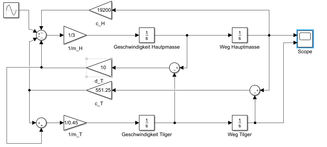 Aufzeichnen soll mir Simulink den Weg der beiden Massen. Der Tilger müsste ja heftig schwingen, da die Anregung mit seiner Eigenkreisfrequenz erfolgt.