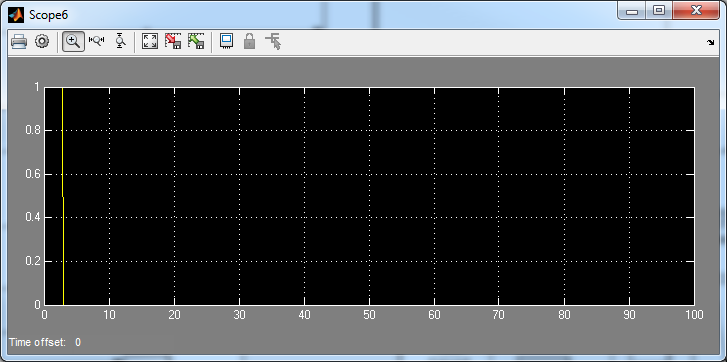 Wenn ich mit jetzt ein Signal anschauen will und die Skalierung über Autoscale anpasse, werden die Limits der Achsen auf die Extremwerte des Signals gelegt. Soweit, so richtig. Bei meinen nun überwiegend waagerecht verlaufenden Signalen ist das leider etwas suboptimal, da nun meine Signale nicht vollständig angezeigt werden und am unteren, bzw. oberen Anzeigerand verschwinden. So habe ich manchmal nur eine senkrechte Linie sichtbar im Scope (siehe Bild) und muss die Achslimits händisch anpassen, um das ganze Signal sehen zu können (was auf Dauer ein wenig nervig ist).