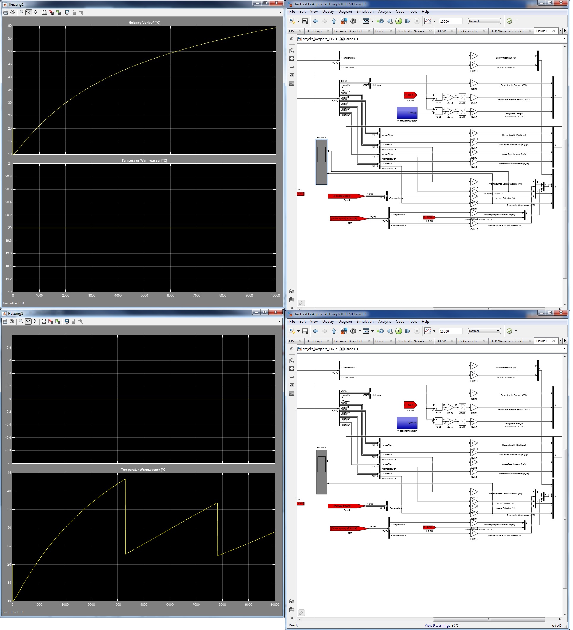 | jeweils links das Scope Ergebnis, rechts daneben das Simulink Modell |