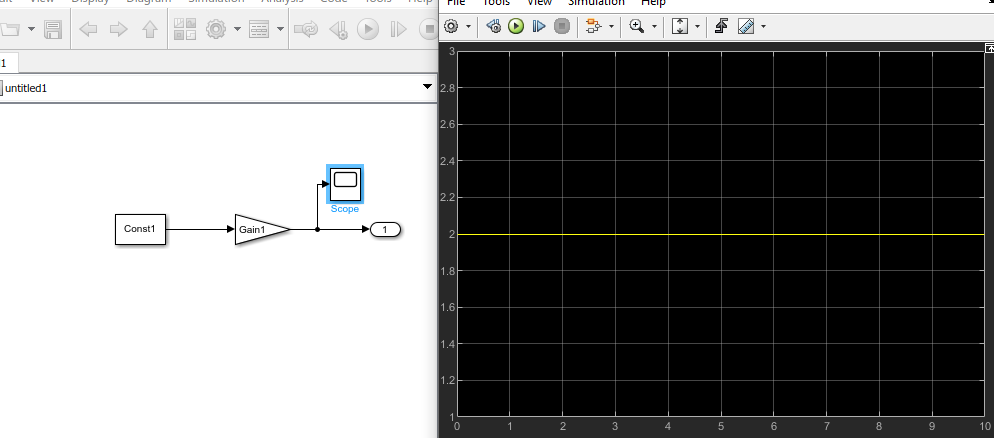 Daraufhin habe ich versucht mich in einfachen Schritten dem Problem zu nähern, indem ich ein total simples Modell erzeugt habe. Dies besteht lediglich aus einer Konstante (mit der Variable Const1 = 1), einem Gain (mit der Variable Gain1 = 2) und einem Output.