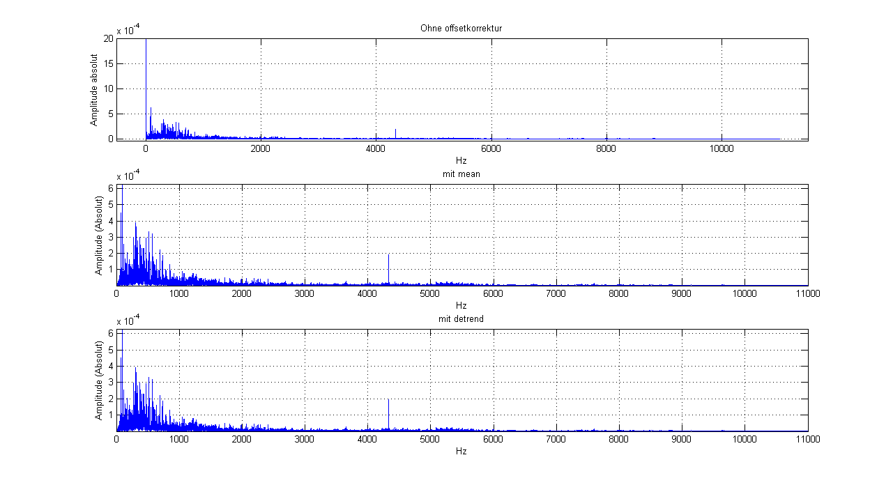 soweit ich mich erinnern kann, hatte ich diese hohe Amplitude bei 0Hz nicht mehr nach dem ich meinen Offset im Zeitbereich mittels mean korrigiert hatte! leider habe ich gerade nicht die Messdaten parat und kann die beiden Funktionen (mean und detrand) nicht miteinander vergleichen. (vllt. komme ich diese Woche noch an die Messdaten ran und werde dann hier posten ob ich einen Unterschied feststellen kann)