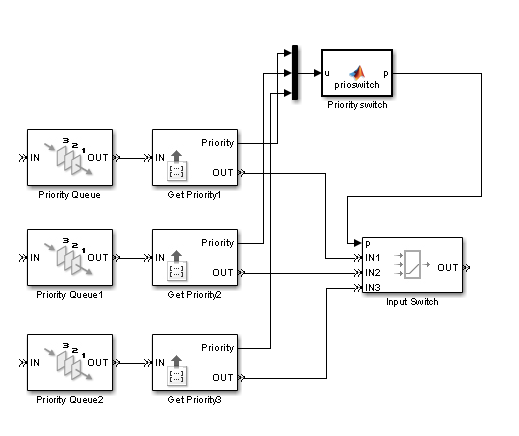 Ich wollte es so lösen, dass ich die Priorität der obersten Queue Elemente in eine MATLAB Funktion gebe und darüber dann den Input Switch zur Selektion des aktiven Ports ansteuere. Dieser Ansatz ist aber problematisch für den Fall, dass eine der Queues leer ist und noch veraltete Prioritätswerte an die MATLAB Funktion übergeben werden.