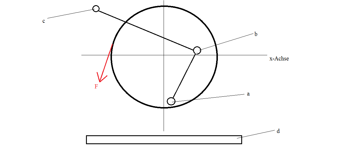 Das Problem: Sobald Punkt a die x-Achse schneidet, dreht sich die Seilrolle automatisch um 360°. Selbst wenn ich die Feder ganz rechts im Bereich d fixiere - kommt es zu diesem Verhalten, was in meinen Augen nicht möglich ist.
