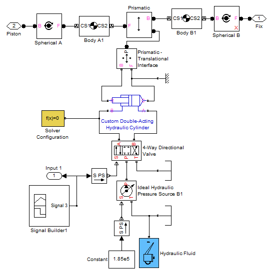 Ich habe in meinem Projekt Komponenten aus Simmechanics mit welchen aus Simhydraulics verbunden. Dabei soll die Bewegung (2D) eines hydraulischen Arms simuliert werden.