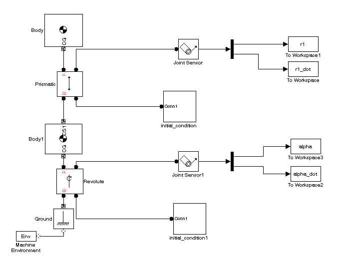 Ich habe ein ziemlich einfaches SimMechanics Modell: Ein Massepunkt der Masse 1kg ist rotier- und verschiebbar mit der Umgebung verbunden, dabei wird der Drehwinkel Alpha und der Abstand vom Ausgangspunkt r1 sowie die beiden Ableitungen davon gemessen. Dank den Anfangsbedingungen gilt: alpha[0] = pi/3 rad, alpha_dot[0] = 4.5 rad/s, r1[0] = 1, r1_dot[0] = 0.