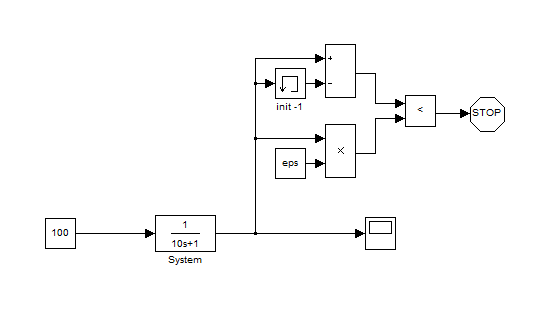 Dann reicht es die Differenz aus aktuellem und vorangegangenem Simulationsschritt zu bewerten. Wenn die Differenz kleiner als ein Wert W ist, bricht die Simulation ab. Die Frage ist nun wie man W wählt. Eine Möglichkeit wäre W als epsilon zu wählen (eps ist die kleinste Zahl für die gilt: 1+eps != 1 (das kommt durch die Darstellung von Fließkommazahlen, siehe IEEE754)). Es muss nicht unbedingt epsilon sein, es kann z.B. auch 0.001 sein. Dann hast du aber das Problem, dass dein Abbruchkriterium absolut ist, und nicht relativ (zu erwarteten Endwert). Sprich: Wenn dein Endwert umd die 1000 liegt bist du sehr genau, wenn er aber bei 0.01 liegt, machst du relativ einen großen Fehler. Um das zu umgehen multipliziert man W mit dem aktuellen Ausgang des Systems. Siehe Bild.