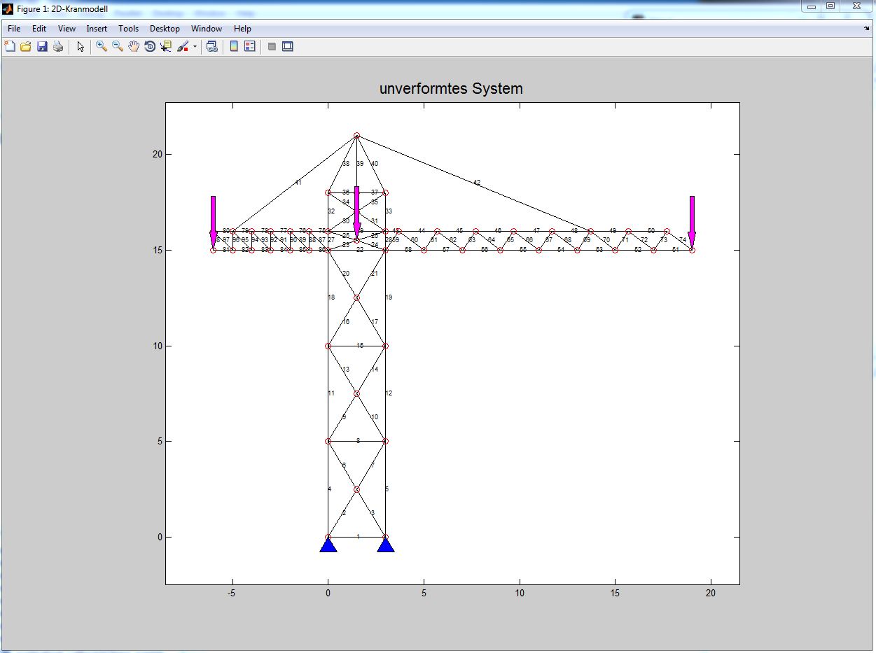 Erstellen Sie ein Stabmodell eines Kranes in Matlab und berechnen Sie die Stabkräfte und die Verschiebung!