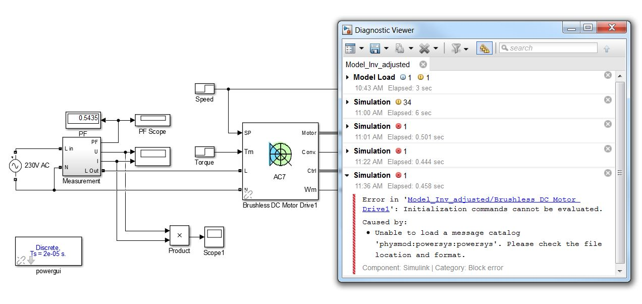 Error in Modelname/Brushless DC Motor Drive: Initialization cannot be evaluated. Caused by: Unable to load a message catalog physmod:powersys:powersys. Please check the file location and format.