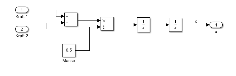 ich hätte mal eine Frage bzgl. Simulink. Im angehängten Bild ist der Modellausschnitt zu sehen, der für mich relevant ist. Ich habe zwei simulierte Kräfte, die ich voneinander subtrahieren möchte, um dann nach der Teilung durch die Masse aus der Beschleunigung mittels doppelintegral den Weg einer Komponente zu jedem Zeitpunkt zu ermitteln.