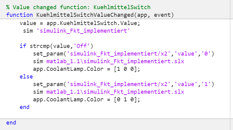 Außerdem möchte ich beim Öffnen meiner GUI, dass sich meine GUI die Ergebnisse zu erst aus Simulink holt. Aktuell stehen meine Toggle-Switches immer auf off, obwohl in meiner Simulink Datei z.B. eine 1 und der dazugehörige Schalter auf OFF (0) steht. Erst wenn ich den Schalter mehrmals betätige passt mein Zustand.