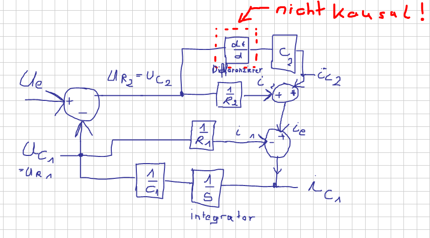 | mein Lösungsversuch des Blockschaltbildes. Nur leider mit einem Differenzierer, der nicht benutzt werden soll. |