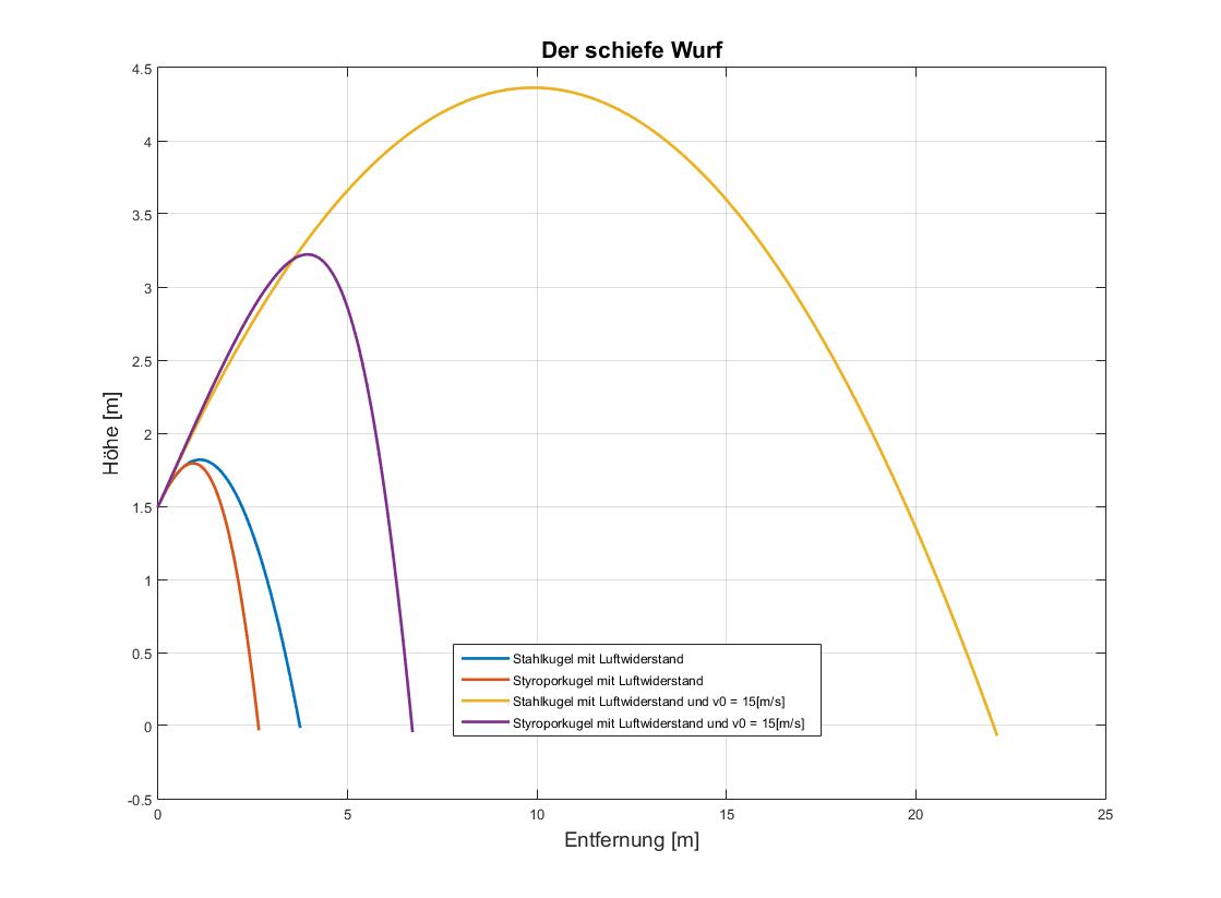 Flugbahn ohne Luftwiderstand weiter als mit. Das passt ja, nur die Distanz hätte ich mir größer vorgestellt.