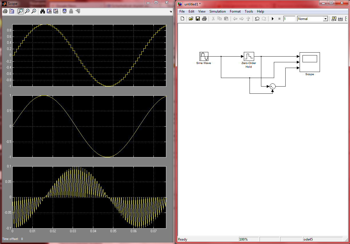 Wenn ich das in Simulink versuche, dann habe ich einen Sinusblock, ein Zero Order Hold und 2 Simout. Ein abgetastetes simout und ein originales.