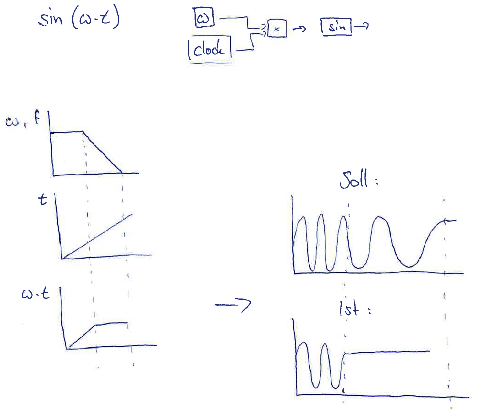 Das Problem: Bei sinkender Frequenz sollte der Sinus immer "langsamer" werden bis er bei Frequenz=0 konstant ist. Nun bilde ich den Sinus aber aus dem Produkt Zeit x Frequenz. Wenn die Frequenz genauso schnell sinkt wie die Zeit steigt, erhalte ich beim Produkt eine Konstante. Und der Sinus einer Konstanten ist nunmal auch konstant.