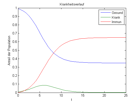 Ich hab das Verfahren nun zunächst mit ODE45 gelöst. Klappt wunderbar. Leider sollen wir nun das Runge Kutta Verfahren selber programmieren und das mag nicht so 100% klappen. Die Gleichungen u(t) und v(t) werden richtig geplottet, nur w(t) wird im Vergleich zu meiner ersten Lösung (mit der vordefinierten ODE45 Funktion) nicht richtig dagestellt (der Steigung ist etwas zu steil und somit der letzte Wert zu hoch, so dass u(t)+v(t)+w(t)=1 nicht mehr erfüllt ist).
