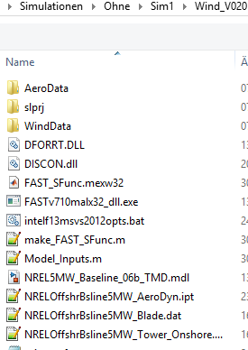| All diese Ordner beinhalten eine Input Datei "primary.fst" und ein Modell "NREL5MW_Baseline_06b_TMD.mdl", dass nach dem Öffnen und nach dem Starten dazu auffordert die primary.fst ins Command Window einzugeben. |