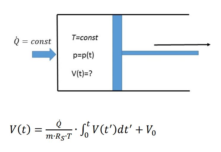 Ausgegangen ist man vom ersten Hauptsatz der Thermodynamik. Die Differantialgleichung sollte vorher noch für eine isotherme Expansion bei konstantem Q abgeleitet werden. Gesucht war die Vulumenänderung als Funktion der Zeit.