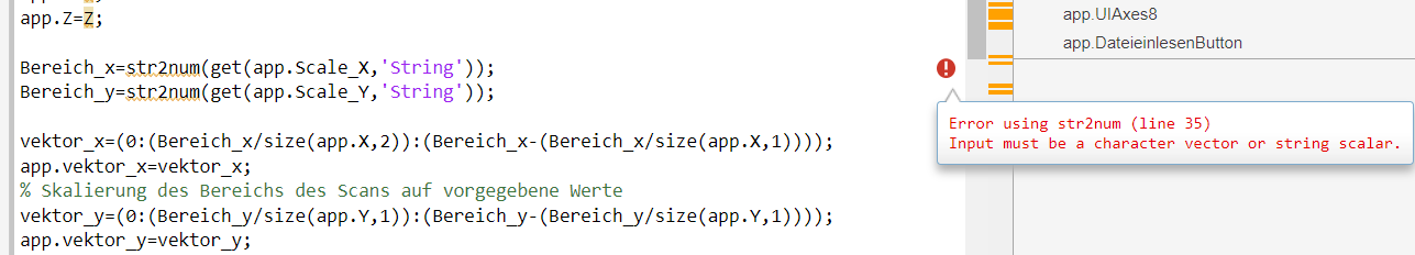 Für numerische Daten, die eingegeben / angezeigt werden sollen, gibt es in App Designer speziell ein numeric edit field. Meine Empfehlung wäre, das zu verwenden. Dann sparst du dir nämlich du Umwandlung und bekommst eine vernünftige Fehlerbehandlung, falls jemand statt numerischer Werte Unsinn eingibt.