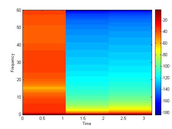 Ich möchte meine FFT in einem Spektrogramm darstellen. Leider kommt nicht das raus, was ich erwartet hätte (siehe Bild). Nämlich 3 Frequenzbänder (hier bei f1, f2, f3). Was mich auch wundert ist das ich bis 1,1ms einen fetten roten Balken habe.