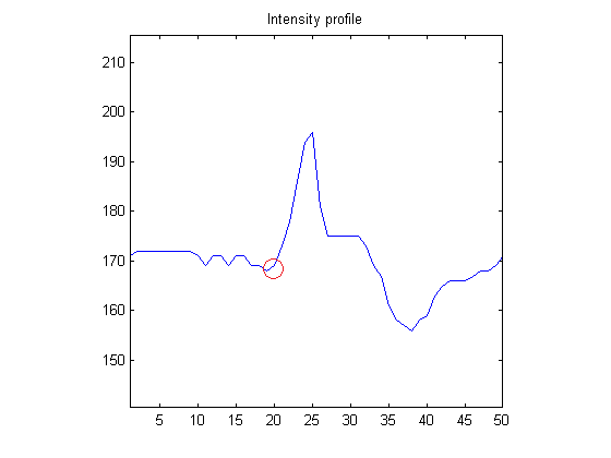 Ich sitz gerad vor einem Problem. Ich mach ein Object-tracking indem ich ein video in einzelne frames zerlege. Ich hab dann Bilder in denen eine vertikale Kante auftaucht. Ich hab jetzt mit der improfile funktion ein horizontales intensitäts profil erstellt um die position der Kante rauszufinden (siehe Anhang). Da dieses Profil mehrere peaks hat und ich aber nur den peak brauch wo sich der Kontrast auf einmal ändert (rot eingekreist) weiß ich nicht recht wie ich diesen am besten bestimmen kann. Gibts da Möglichkeiten in Richtung Kurvendiskussion? Die intensity Profiles die ich untersuch haben immer den Verlauf dass sie zuerst relativ konstant sind und dann eben die Kante kommt, d.h. der Farbwert plötzlich ansteigt oder auch abfällt.