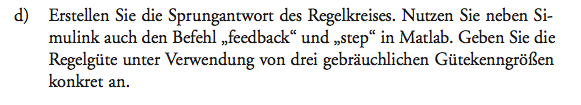 Untersuchen Sie den Regelkreis auf Stabilität indem Sie die Pollagen der Laplace-Übertragungsfunktion prüfen (Hinweis: Nutzen Sie die Matlab Befehle "roots", "Damp" oder pzmap").