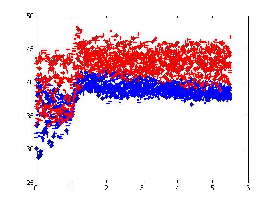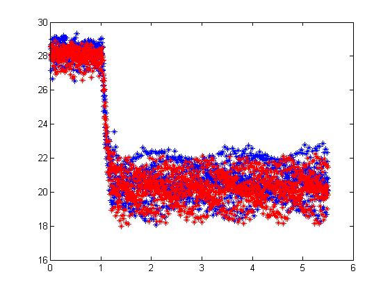 "Nun ist ja die rote und die blaue Messkurve verrauscht. Also kann man auch zu einem bestimmten X-Wert nicht einen exakten (roten oder blauen) Y-Wert angeben, sondern nur einen Bereich (z.B. eine Standardabweichung), oder? Dann wird auch bei einer "idealen" Messung nur eine gewisse Überlappung vorliegen, aber keine exakte Identität der beiden Kurven. Was bedeutet das für deine Fragestellung?"