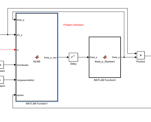 Ich starte nun mit theta_p als [0;0;0;0] Vektor. Außerhalb der Funktion wird dann theta_p_neu über ein Delay (z^-1) als nächster theta_p Wert zurück an die Funktion gegeben, sodass ich im Schritt k=0 für theta_p den Startwert 0 habe und im Schritt k=1 dann irgendeinen neuen Wert, der sich in der Funktion ergeben hat.