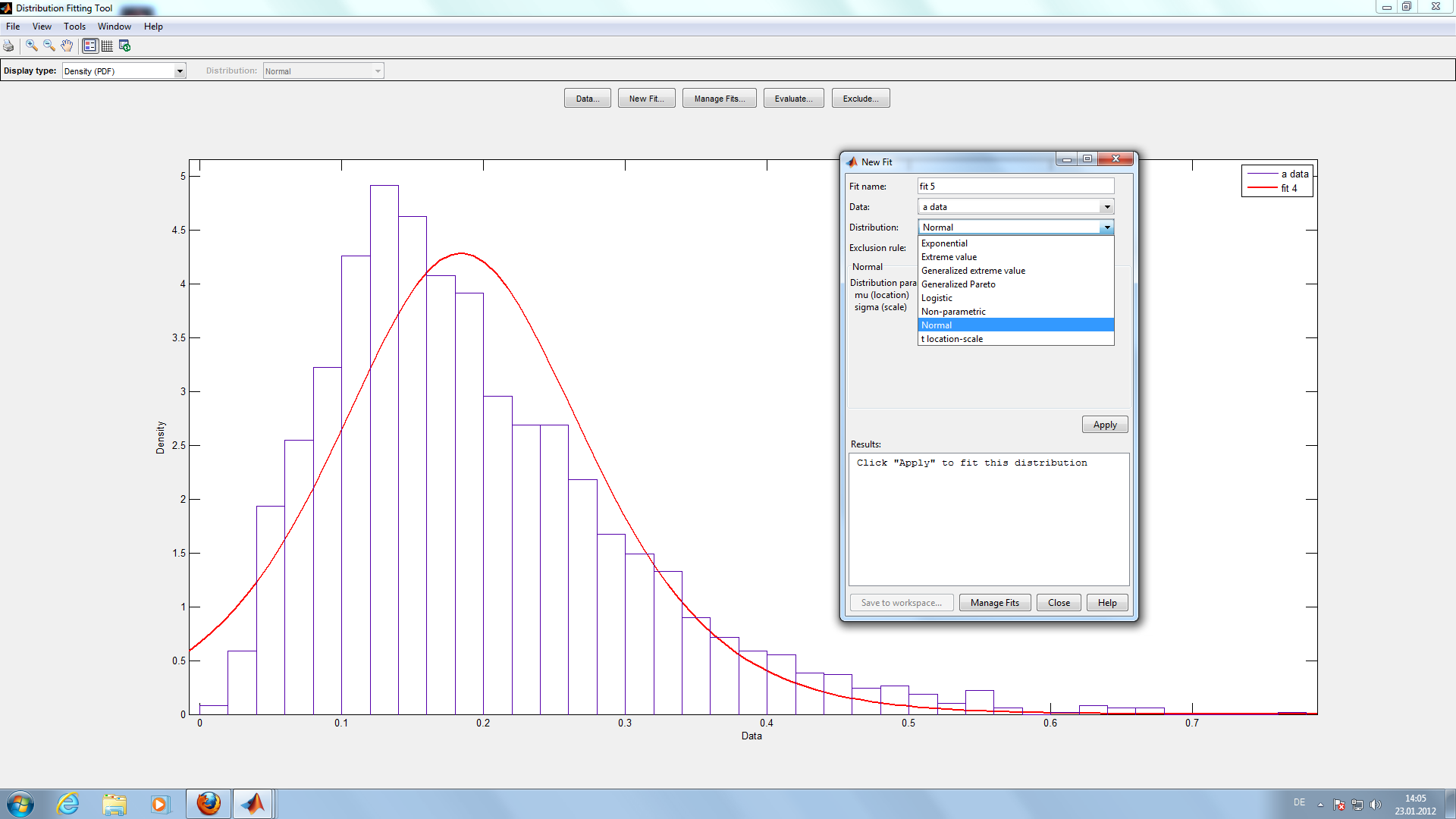 ich habe eine Reihe von Messwerten im Bereich von 0,01 und 0,7. Nun möchte ich mit der Statistik Toolbox ein Histogramm ploten lassen und darauf 3 fits erstellen. Eine Normalverteilung ist kein problem, aber ich versuche noch eine Weibullverteilung und eine log. Normalverteilung zu "fitten". ich weiß, dass das gehen muss, da ich dies in einer Bachelorarbeit gesehen habe (wurde definitiv mit Matlab gemacht).