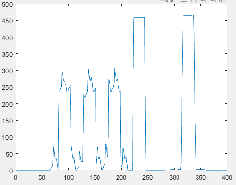Im Prinzip möchtest du die Anzahl der Peaks in deinem schon erstellten Plot ausgeben. Matlab bietet die Funktion islocalmax() dafür an. Mit den Standardeinstellungen wird die Funktion allerdings auch die kleinen Peaks deiner ersten drei großen Peaks als lokales Maximum erkennen, mit den Zusatzparametern kannst du das vmtl. beheben, Stichwort 'MinSeparation'.