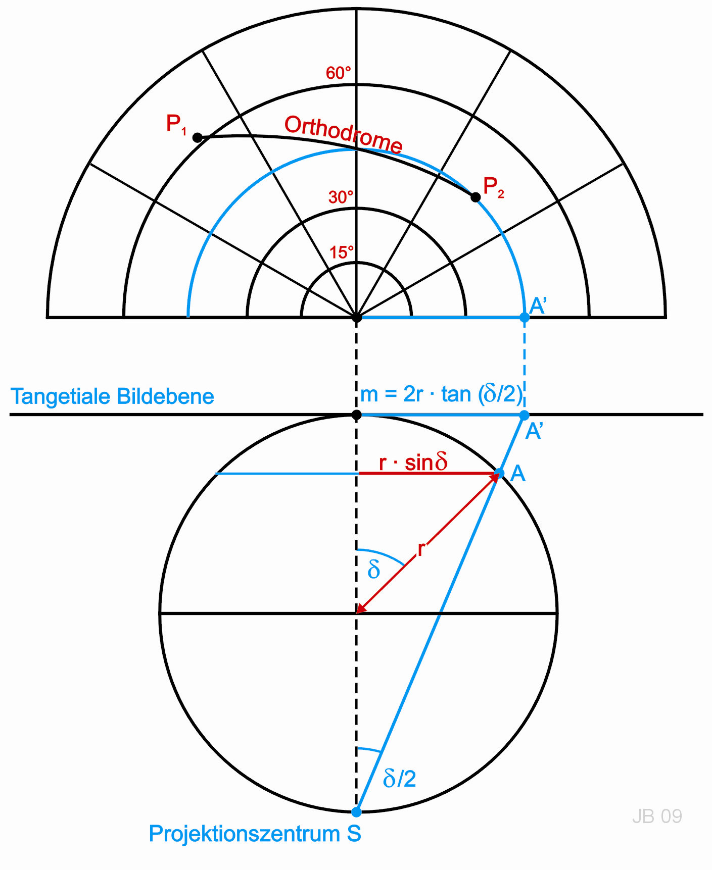 m=2*r(Kugelradius)*tan((pi/2-phi)/2) phi.. 1. Koordinate auf Kugel von Punkt A