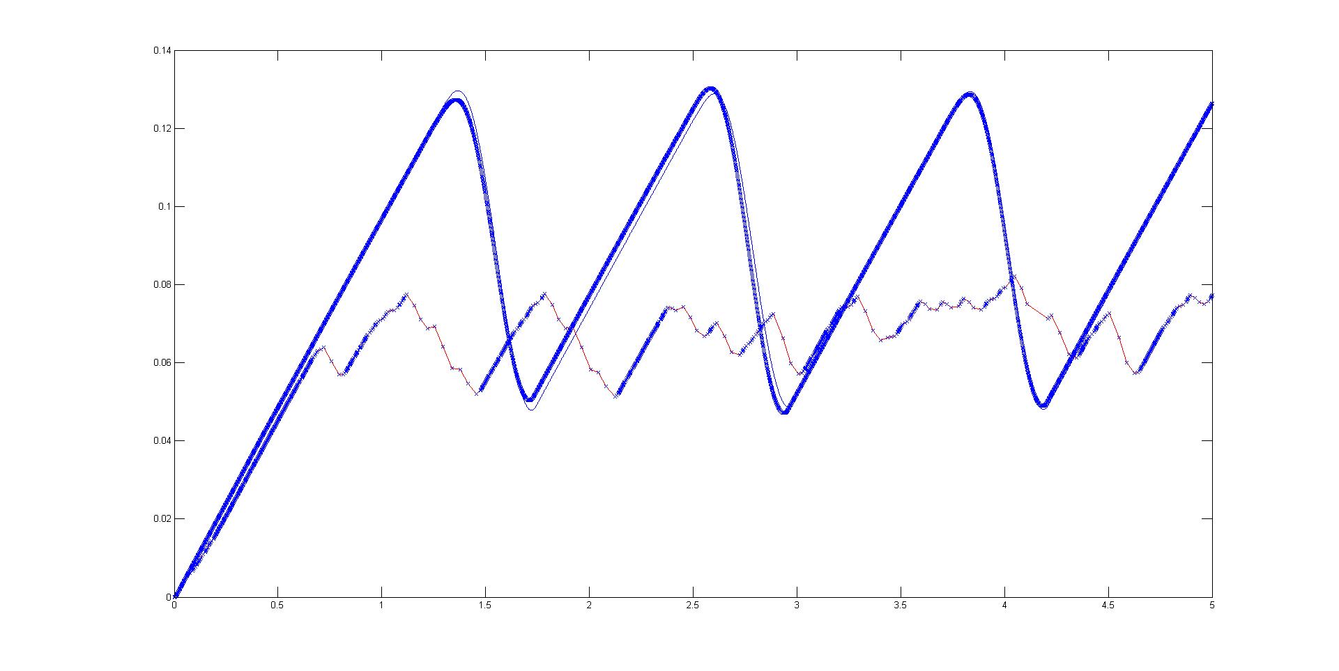 Du kannst bei deinem Modell ja mal die Schrittweite bei ode5 verkleinern. Wenn du das ausreichend tust, sollte sich der Verlauf dem von ode45 berechneten Verlauf annähern. Falls nicht, mal die Toleranz von ode45 heruntersetzen.