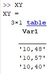Ich habe eine Tabelle mit String einträgen - siehe Anhang. Aus dieser würde ich gerne einen Vektor generieren - > xy=[10.48 10.57 10.40]