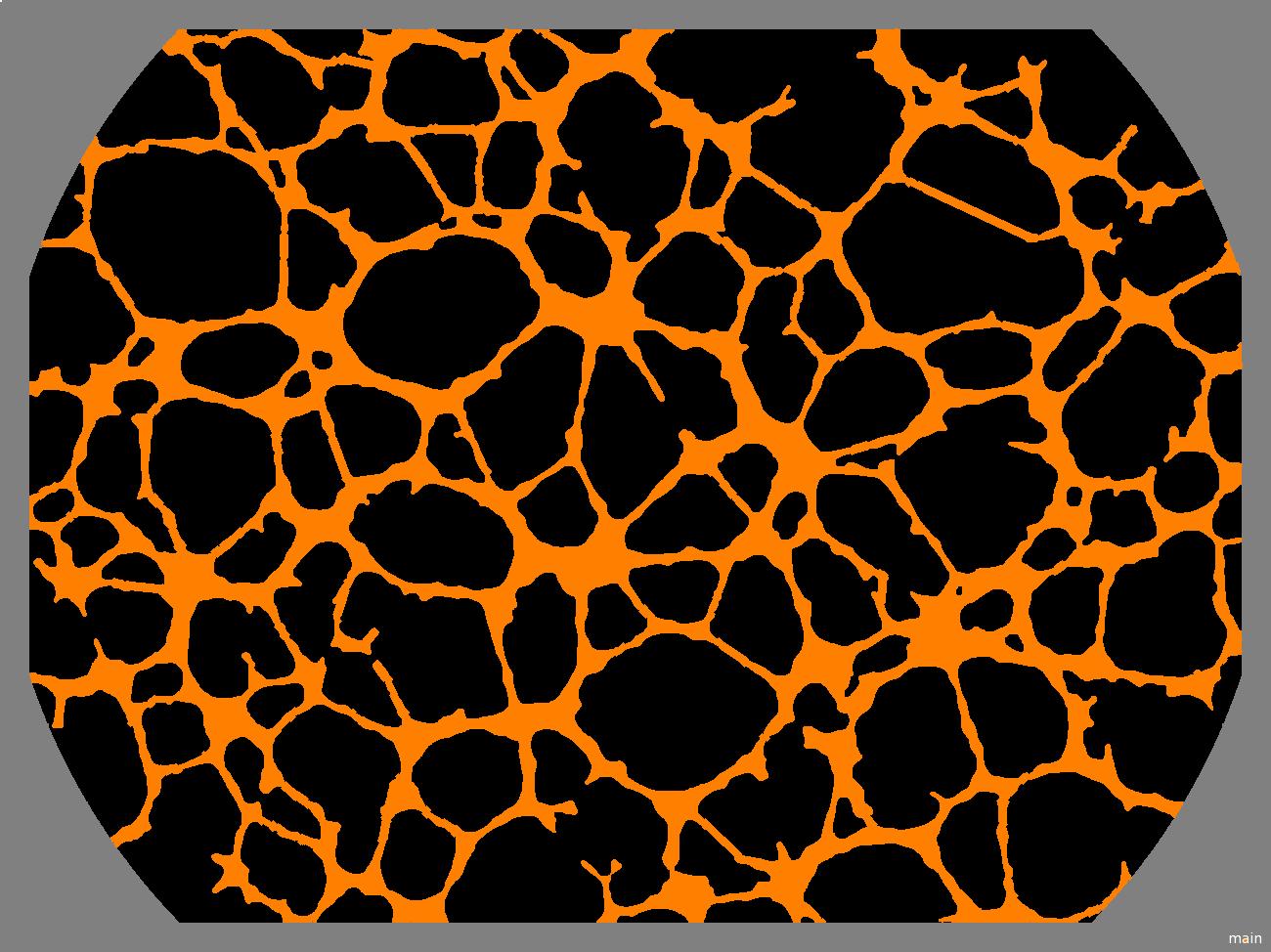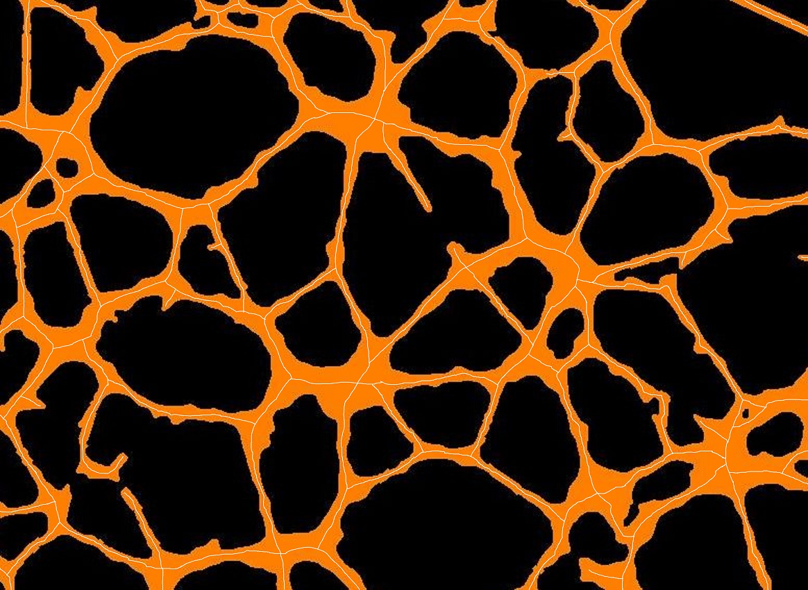 Ich möchte ein Matlab-Programm schreiben, welches das "Skelett" dieser Struktur erkennt. Dabei soll möglichst eine 1-Pixel-Linie die Struktur darstellen. Das Ergebnis soll ca. aussehen wie der Anhang Skelett (hier ist das Skelett von Hand in weiß in das Originalbild eingezeichnet).