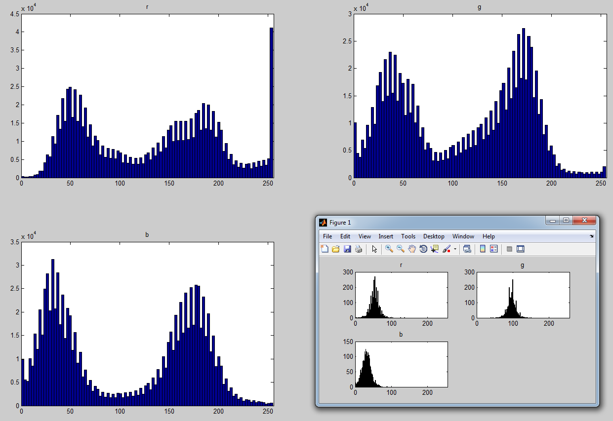 Im Anhang zu sehen sind die 3 Farbkanäle für das gesamte Bild und rechts unten die Aufteilung für die Objekte, die von der binären Maske gefunden werden sollen.