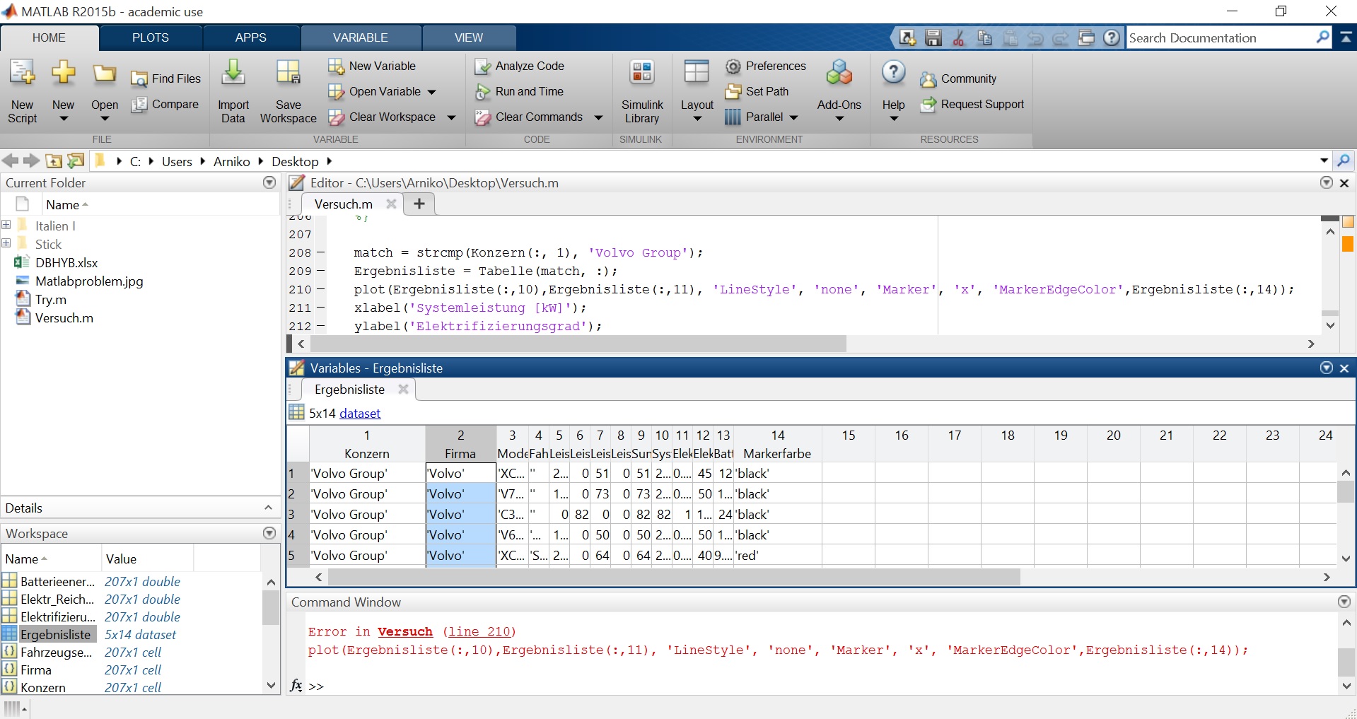 3. Aus dem Cell-Array "Ergebnisliste" wird nun der Plot erstellt, x- & y-Koordinaten werden hierbei korrekt ausgelesen, bei der Wahl der Markerfarbe soll er auf die Ergebnisliste(:,14)) zurückgreifen.