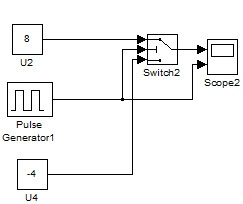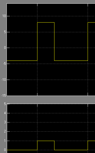 Ich habe zwei Schaltungen simuliert. Einmal mit zwei Konstant(-Spannungs)blöcken, bei denen das Scope auch die Schaltflanken richtig interpretiert und ein Rechtecksignal entsteht.