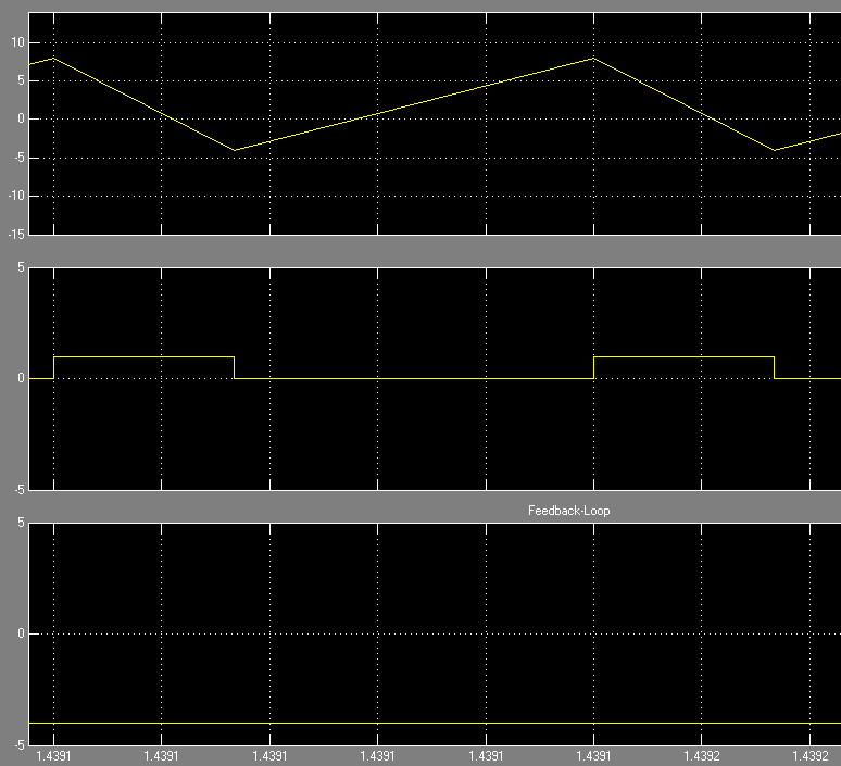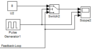 Bei der zweiten "echten" Simulation kommt das 2. Signal aus einer Rückschleife, die im Scope als unterstes Signal dargestellt ist.