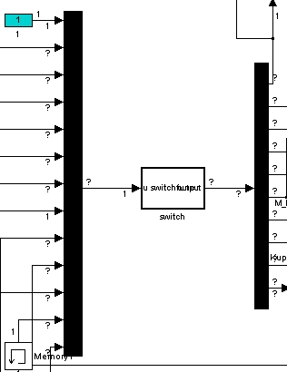 Nächstes Problem ist eine algebraische Schleife (du hast ja schon versucht, die meisten über delay-Blöcke aufzubrechen). Mein grundsätzlicher Tip zum Auflösen von algebraischen Schleifen ist, diese NICHT über Delay-Blöcke aufzubrechen, weil diese das Systemverhalten gravierend ändern können. Alternativ kannst du versuchen, deine Gleichungen umzuschreiben. Wie auch immer.. du hast immer noch eine algebraische Schleife (unten bei den beiden Mux und Demux Blöcken). Diese musst du dann, wenn du mit Memory oder Delay Blöcken das machst, auch entsprechend aufbrechen.