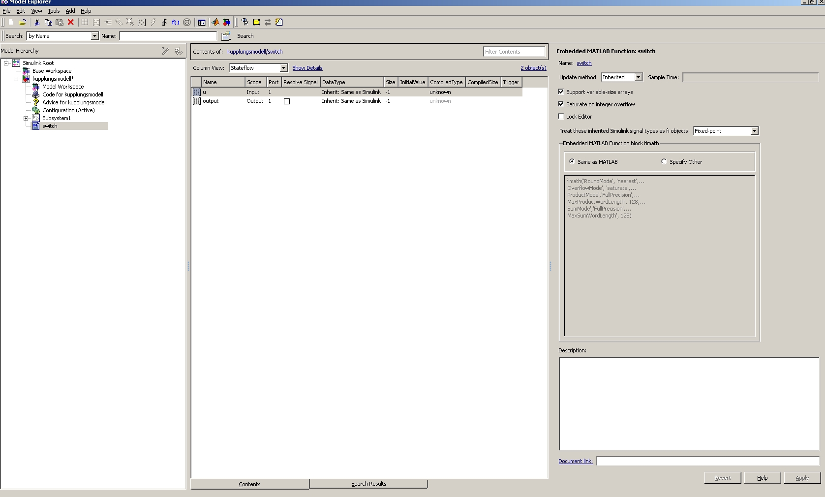 ich bin neu hier im Forum und beschäftige mich auch erst seit ein paar Wochen ausführlicher mit Simulink. Ich habe ein Simulationsmodell erstellt, in dem ich eine Switchfunction benötige. Wenn ich das Modell simulieren lassen möchte, dann kommt leider nur eine geballte Anzahl an Fehlern.
