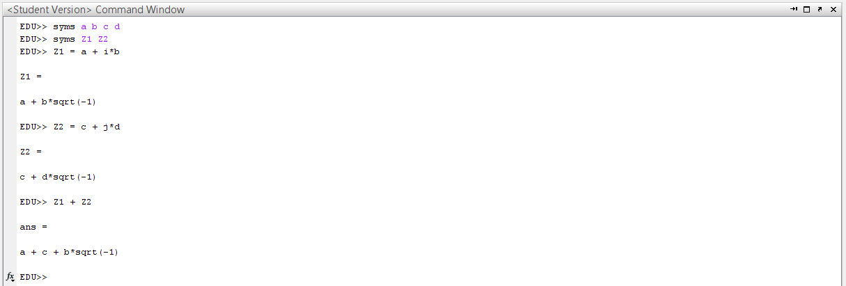 Entweder verstehe ich die Verwendung von symbolic math nicht richtig oder irgendwas läuft schief. Und zwar ersetzt Matlab i bzw. j bzw. 1i immer direkt durch sqrt(-1), siehe Screenshot 1. Soll das so sein? Wäre es nicht schöner wenn j stehen bleiben würde? Wenn ich j ebenfalls als Sym definiere dann ist es ja nur noch ein Symbol und nicht mehr die komplexe Einheit.