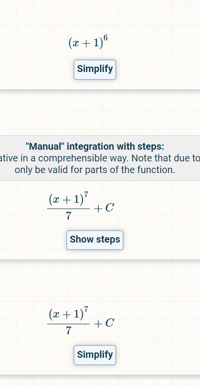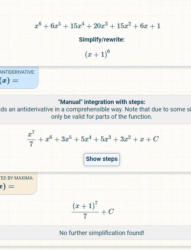 Also der Integralrechner kommt immer auf das gleiche Integral, egal wie man die Funktion schreibt (auch die expanded (x+1)^6). Es ist auffällig, dass er aber vor der Integration die Funktion auch simplifiziert. Ich teste da nochmal etwas in Matlab rum und lasse es sonst ggf. sein.
