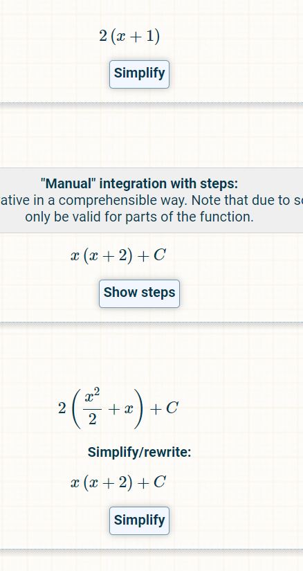 Ich integriere mal 2*(x+1), was ja genau das gleiche ist. Das Ergebnis ist für mich hier ebenso klar: (x+1)^2.