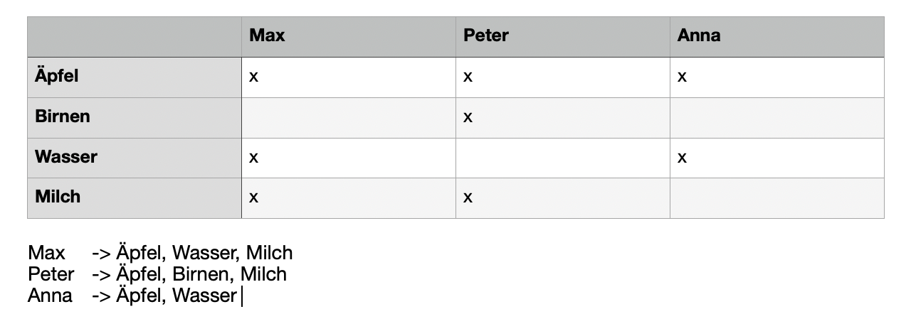 Das ganze möchte ich dann "zusammen klicken" - Also so das ich wählen kann, dass Name A, Wasser und Milch benötigt, Name B Äpfel und Name C Wasser und Birnen. (s. beigefügtes Bild)
