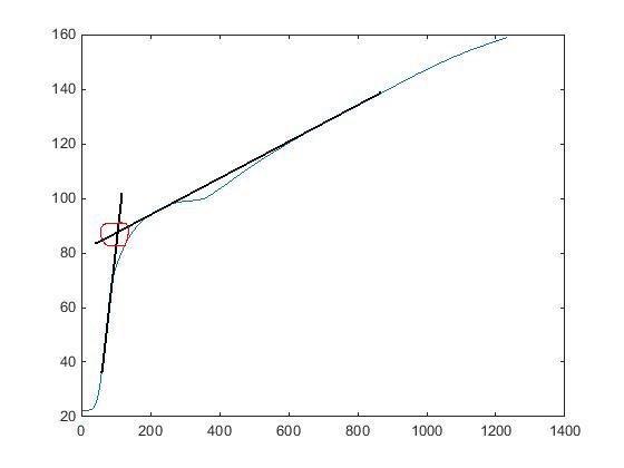 Nun habe ich folgendes Problem und zwar habe ich über 100 Messwerte, die folgende Kurve darstellt (im Anhang). An diese Kurve soll ich nun 2 Tangenten anlegen und deren Schnittpunkt berechnen lassen, dies habe ich bereits in der Kurve markiert, wie das aussehen soll.