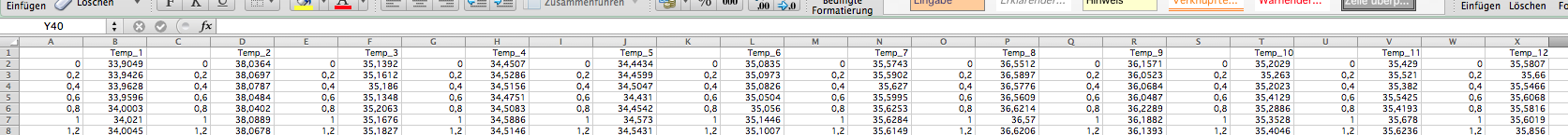 Ich habe eine Spalte pro Temperaturfühler (also 12 Spalten) und dazu dann für alle 0,2 Sekunden eine Zeile in der für jede Spalte der gemessene Temperaturwert (z.B. 100,1234) steht.