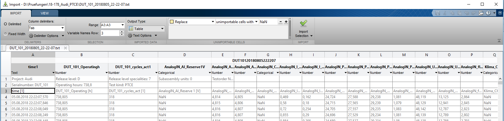 Seit 1,5 Tagen versuche ich auf einen grünen Zwei zu kommen, leider bisher ohne Erfolg. Das Importtool (Import Data) von Matlab findet ohne Probleme die Variablennamen und ordnet die Daten entsprechend zu.